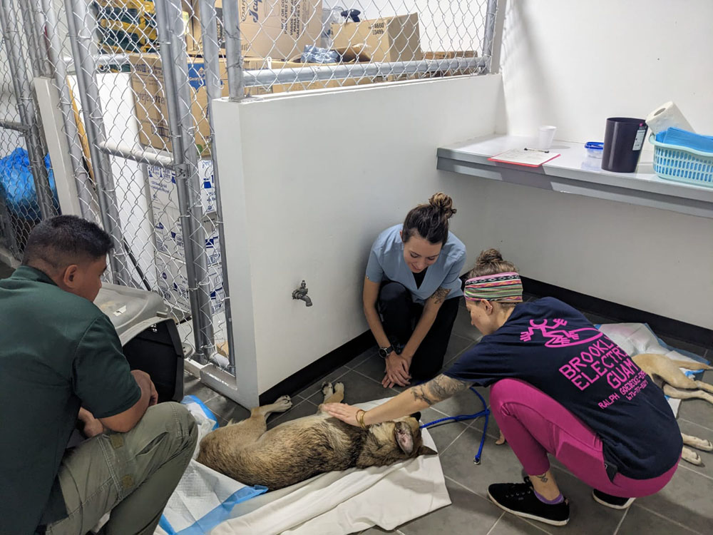 Lauren Cabrera, center, along with Alison Hadley, and Simion Nepayo, check on a dog during the first day of the spay/neuter clinic last week at the Saipan Mayor’s Office Dog Shelter in As Perdido. (CONTRIBUTED PHOTO)