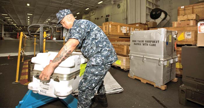 SAN DIEGO—Petty Officer 1st Class Romeo Agulto, from Saipan, stages cargo for maintenance in the hangar bay of aircraft carrier USS Carl Vinson following a 2017 Western Pacific Deployment. Carl Vinson is currently undergoing maintenance in preparation for an upcoming deployment. (U.S. NAVY/MCS3 DANIEL JACKSON NORGART)