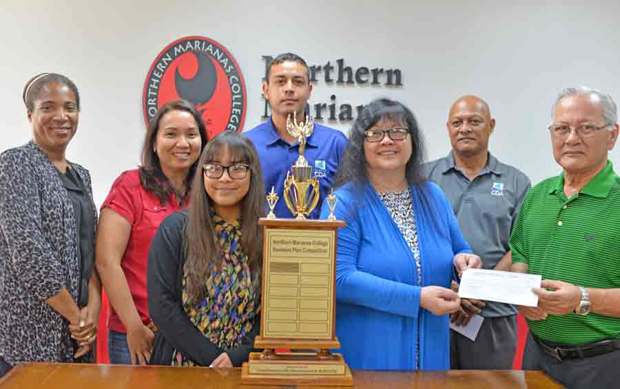 BUSINESS PLAN COMPETITION Commonwealth Development Authority recently recognized Northern Marianas College student Isabelle Matsunaga, third from left, for winning the 2017 Business Plan Competition, which was sponsored by CDA. Matsunaga received a trophy and $1,000 scholarship to use toward her baccalaureate degree. The award presentation was attended by Chavel Green, NMC Business Department chair; Barbara Hunter, NMC Business Department instructor; Isabelle Matsunaga, 2017 CDA Business Plan Competition winner; Michael Camacho, CDA Business development specialist; Dr. Carmen Fernandez, NMC president; Oscar Camacho, CDA economic development analyst; and Manuel Sablan, CDA executive director.