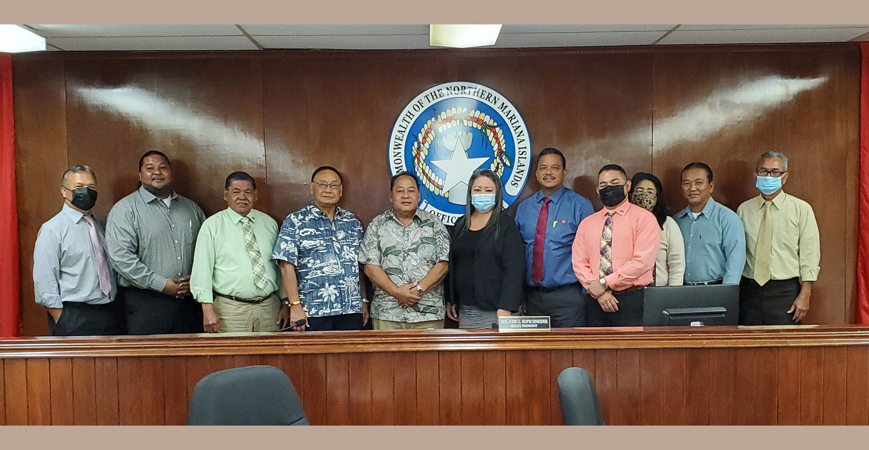 CONFIRMED-Senators pose with newly confirmed Commerce Secretary Edward M. Deleon Guerrero and Commonwealth Economic Development Authority board director Isidro K. Seman after the senators confirmed the two’s executive appointments last Thursday at the Senate chamber. All nine senators voted “yes” to adopt the report of the Senate Committee on Executive Appointments & Government Investigations that recommended the confirmation of the executive appointments of Deleon Guerrero and Seman. (FERDIE DE LA TORRE)