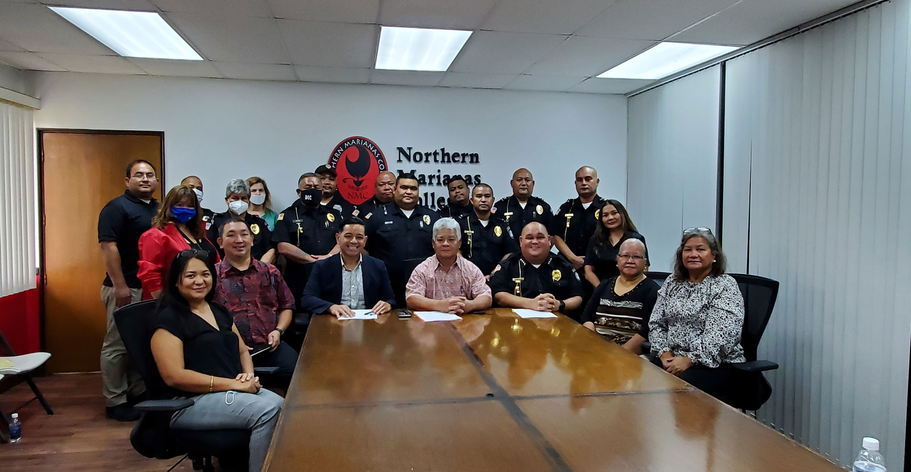CORRECTIONS ACADEMY-Former Northern Marianas College interim president Frankie M. Eliptico, acting governor Arnold I. Palacios, and Department of Corrections Commissioner Wally F. Villagomez are joined by members of the NMC Board of Regents and DOC personnel after the signing of a memorandum of agreement between NMC and DOC at the college’s Board of Regents conference room Wednesday last week for a joint operation between the two institutions to run a Corrections Academy at the college for DOC cadets. (JOSHUA SANTOS)