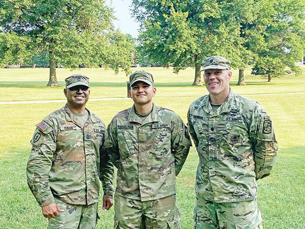 MOVING ON AND UP-Cadet Gavin Pangelinan, center, smiles after graduating from the U.S. Army Cadet Command Advanced Camp at Fort Knox, KY on July 4, 2021. He is joined in the picture by his military science instructors from the University of Guam, Master Sgt. Rocky Duran, left, and Lt. Col. Thomas Anderson. Pangelinan spent 41 days training to be a combat leader in the woods of Fort Knox this summer and he will commission as an Army officer through UoG’s ROTC program in May 2022. Pangelinan is a graduate of Saipan Southern High School. (CONTRIBUTED PHOTO)
