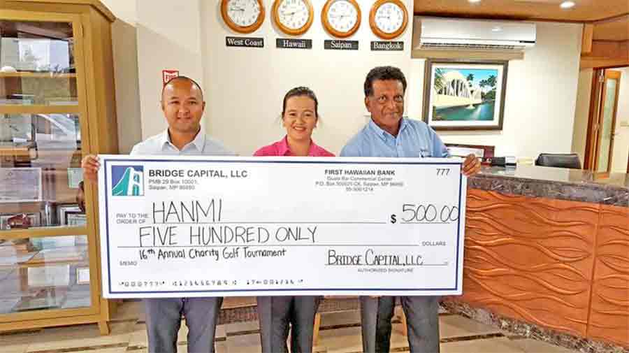 Bridge Capital, LLC Business Development manager Joseph Guerrero, left, presents a donation to 16th HANMI Golf Tournament committee members Socorro Huliganga, center, and Das Krishnan, right, on April 24, 2017. The tournament will be held at Laolao Bay Golf & Resort west course on June 24, 2017.