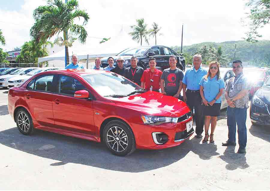 Triple J Motors sponsored a 2017 Mitsubishi Lancer ES as a hole-in-one prize during the 7th Annual Docomo Pacific Golf Classic held at the LaoLao Bay Golf & Resort last Saturday, May 13. Shown with the car are Triple J Motors and Docomo Pacific managers and staff, led by Randy Steele, GM of Triple J Motors, far left, and Ryan Calvo, account executive at Docomo Pacific, far right. (Contributed Photo)
