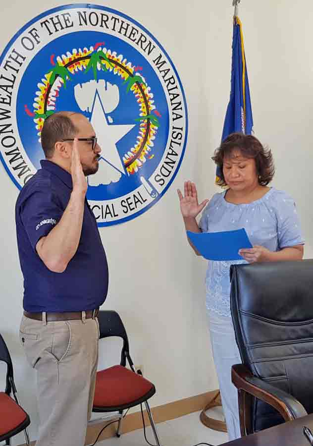 Board of Education chair Maria Lourdes S. Ada administers the oath of office to Mount Carmel School president Galvin Deleon Guerrero yesterday morning. Deleon Guerrero officially began his second consecutive term as the non-public school representative on the CNMI Board of Education. (PSS)