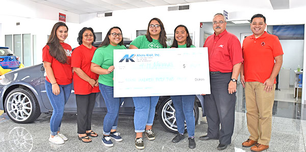 The 4-H Program, together with Northern Marianas College CREES family, community, and youth development program, recently received a donation from Atkins Kroll as part of that company’s outreach and community support efforts. Fom left, Lorenza Aldan, NMC CREES, community and youth development extension aide II; Margaret Tudela, NMC CREES family, community and youth development program manager; Rian Sonoda, 4-H Marianas secretary of business; Alyssa Attao,4-H Marianas vice president; Maya Pangelinan, 4-H Marianas president; Glen Perez, Atkins Kroll sales manager; and Frankie Eliptico, interim VP, Northern Marianas College.