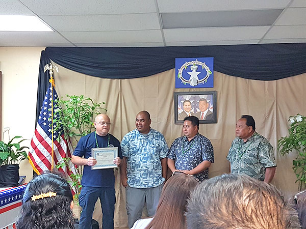 Justin Andrew of the Division of Central Statistic Division is presented with the Leadership award and is honored for his 17 years of government service. during the 2018 Public Service Recognition Award Presentation on May 16 at the Department of Commerce on Capital Hill. Others in the photo are Commerce Secretary Mark O. Rabauliman, Gov. Ralph DLG Torres, and Office of Personnel Management director Isidro K. Seman. (Contributed Photo)