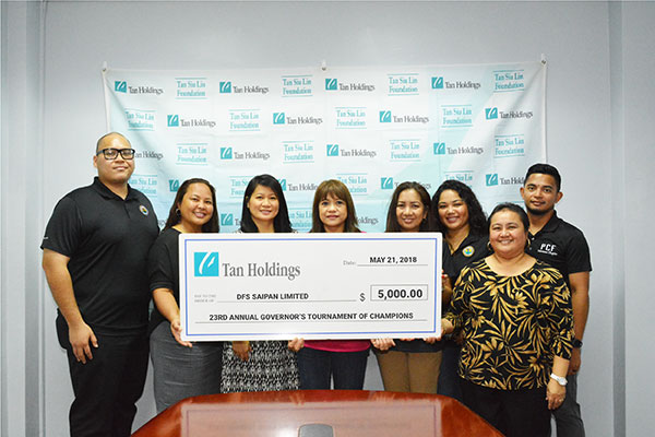 TOC SUPPORTERS-The Tan Siu Lin Foundation recently donated $5,000 to the upcoming Governor’s Tournament of Champions. The tournament will be held this Saturday and Sunday at the Laolao Bay Golf & Resort. TSL community relations director Carline Sablan, second from right, TSL manager Merlie Tolentino, third from right, TSL assistant manager Ray Zapanta, left, and TSL administrative officer Mel Naputi, second from left, present the check donation to the 2018 Governor’s Tournament of Champions committee members. (Contributed Photo)