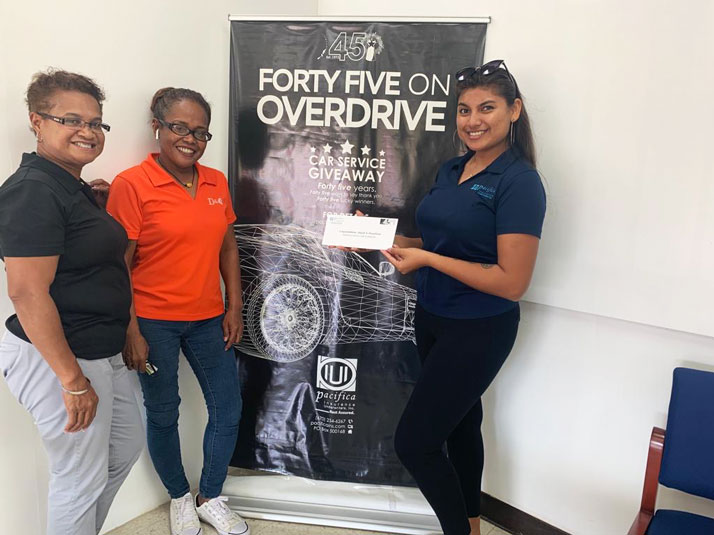 To mark its 45th anniversary, Pacifica Insurance Underwriters, Inc. is giving away free car service maintenance gift certificates to 45 lucky winners throughout 2019. Here, Pacifica Insurance staff member Sheela Saraff, right, presents prize winner Abigail Pangelinan, center, with the car service gift certificate. Pangelinan will be entitled to the Gold Service package at Joeten Motor Co., which includes free oil change, adjustment of tire pressure, 28 multi-point inspections, and other services. Also in the photo is Pangelinan’s friend, Marilyn Marron. For more information about this car service giveaway log on to www.pacificains.com/45years. (Contributed Photo)
