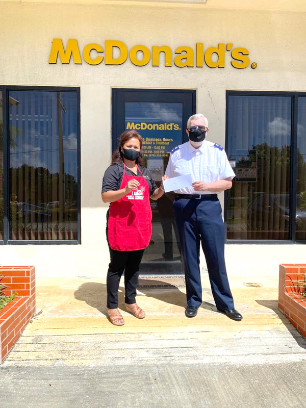 McDonald’s Saipan owner/operator Marcia Ayuyu, left, hands the company’s donation to Salvation Army pastor Wayne Gillespie, right, at the company’s main office in Dan Dan. The donation is part of the CNMI Salvation Army’s “Corporate Red Kettle Challenge,” which enables private companies to give, in lieu of the “Red Kettle Ball” that the Salvation Army cancelled due to the recent cases of COVID-19 in the community.