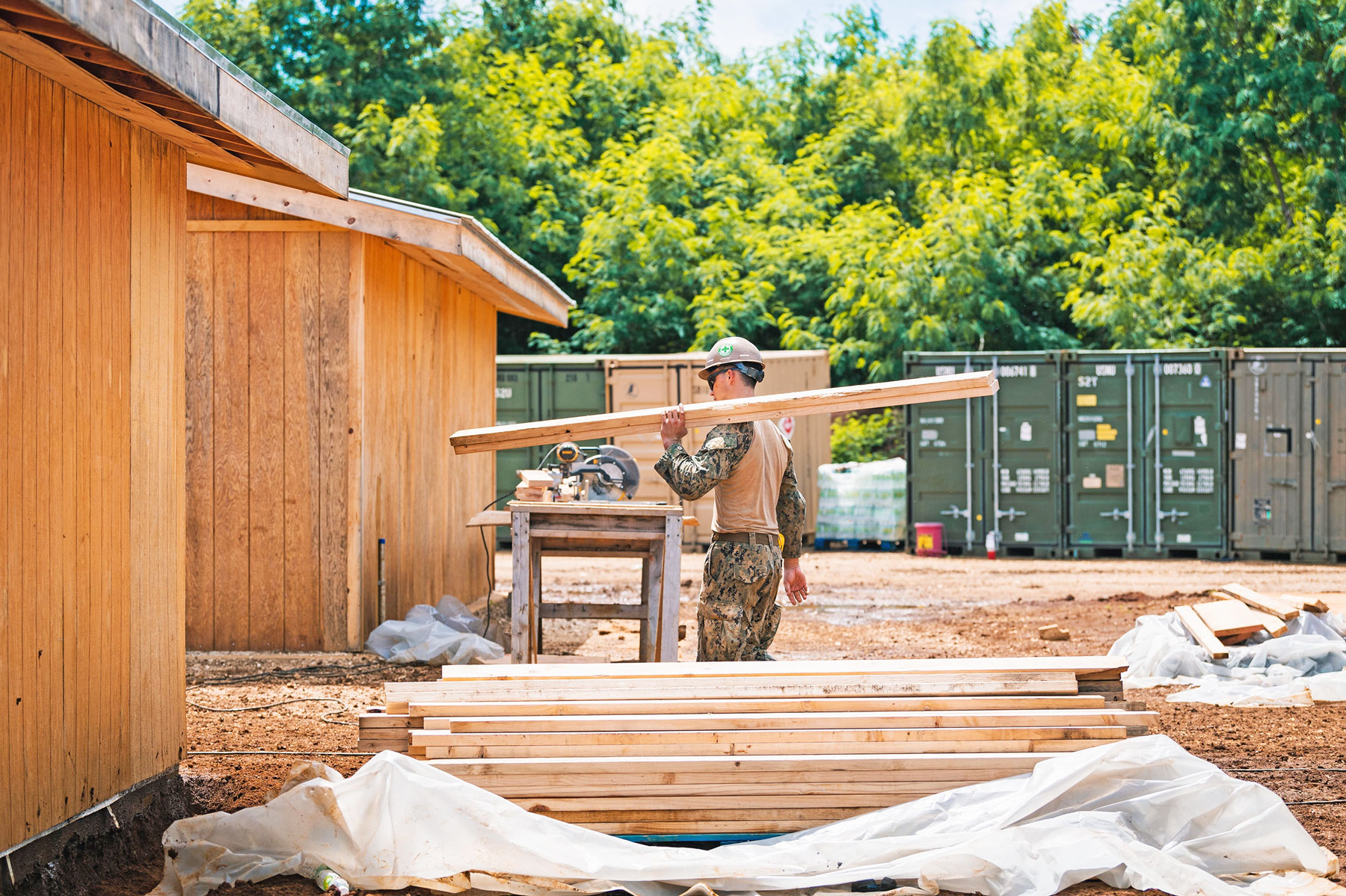 Builder 3rd Class Matthew Best, deployed with the Seabee expeditionary construction and engineering capability of Task Force 75, carries lumber to prefabricated walls in support of Southwest Asia hut construction on Camp Tinian. (U.S. NAVY/MCS2 COLE C. PIELOP)