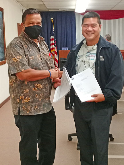 Senate vice president Jude U. Hofschneider (R-Tinian), left, shakes hands with Rep. Ivan A. Blanco (R-Saipan) as they hold the conference committee’s “product” that resolved the Senate’s and House’s disagreements on the government’s budget for fiscal year 2021 during a session in the Senate chamber Wednesday late at night. Hofschneider and Blanco led the Senate and the House teams in the conference committee, respectively. (Ferdie De La Torre)