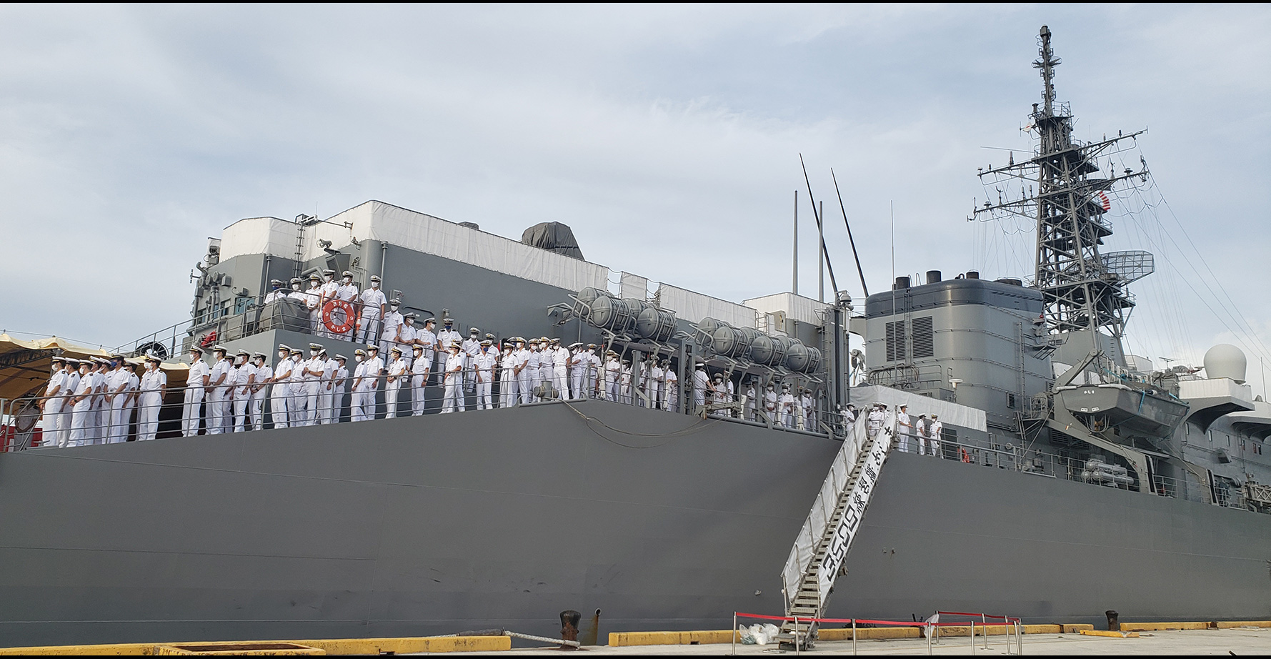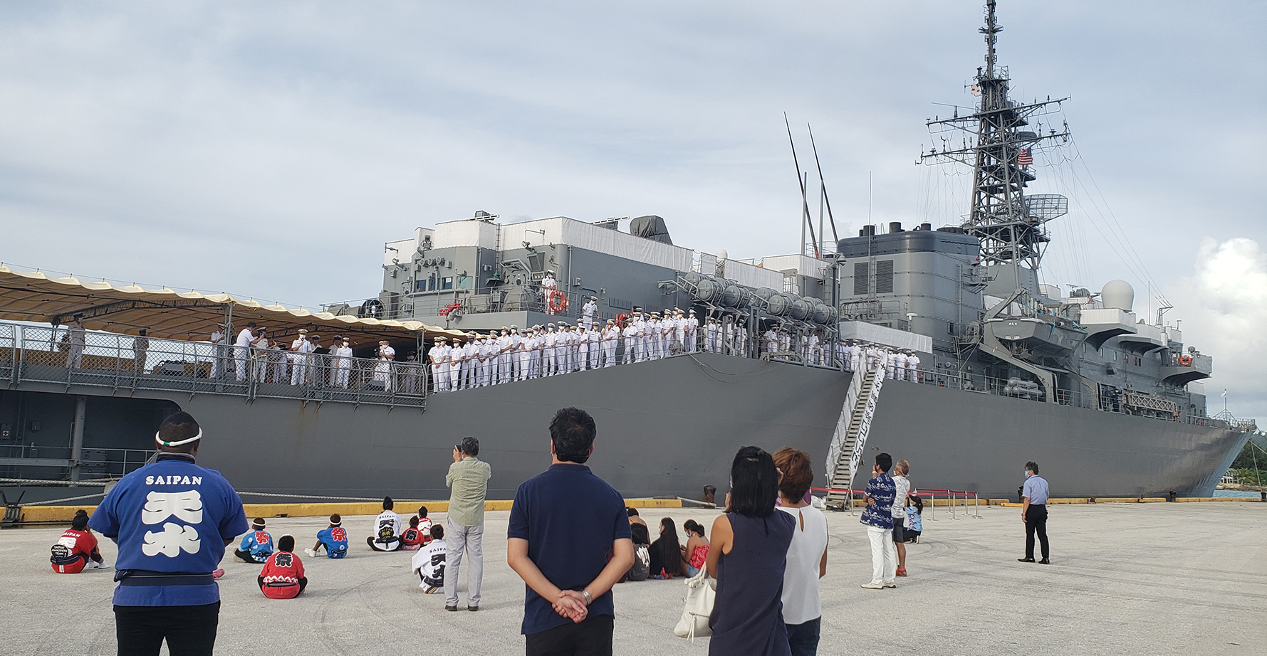 WELCOME TO SAIPAN!-The crew and officers-in-training aboard the Kashima, a Japanese military training vessel, gather on the port side of the vessel to watch special performances, including traditional Chamorro and Carolinian dancers, and the Saipan Awaodori Team. The Kashima, a training vessel of the Japan Maritime Self-Defense Force, dropped anchor on Saipan last Oct. 14 to refuel and resupply and left on Oct. 16, 2020. (NEIL FAMA)