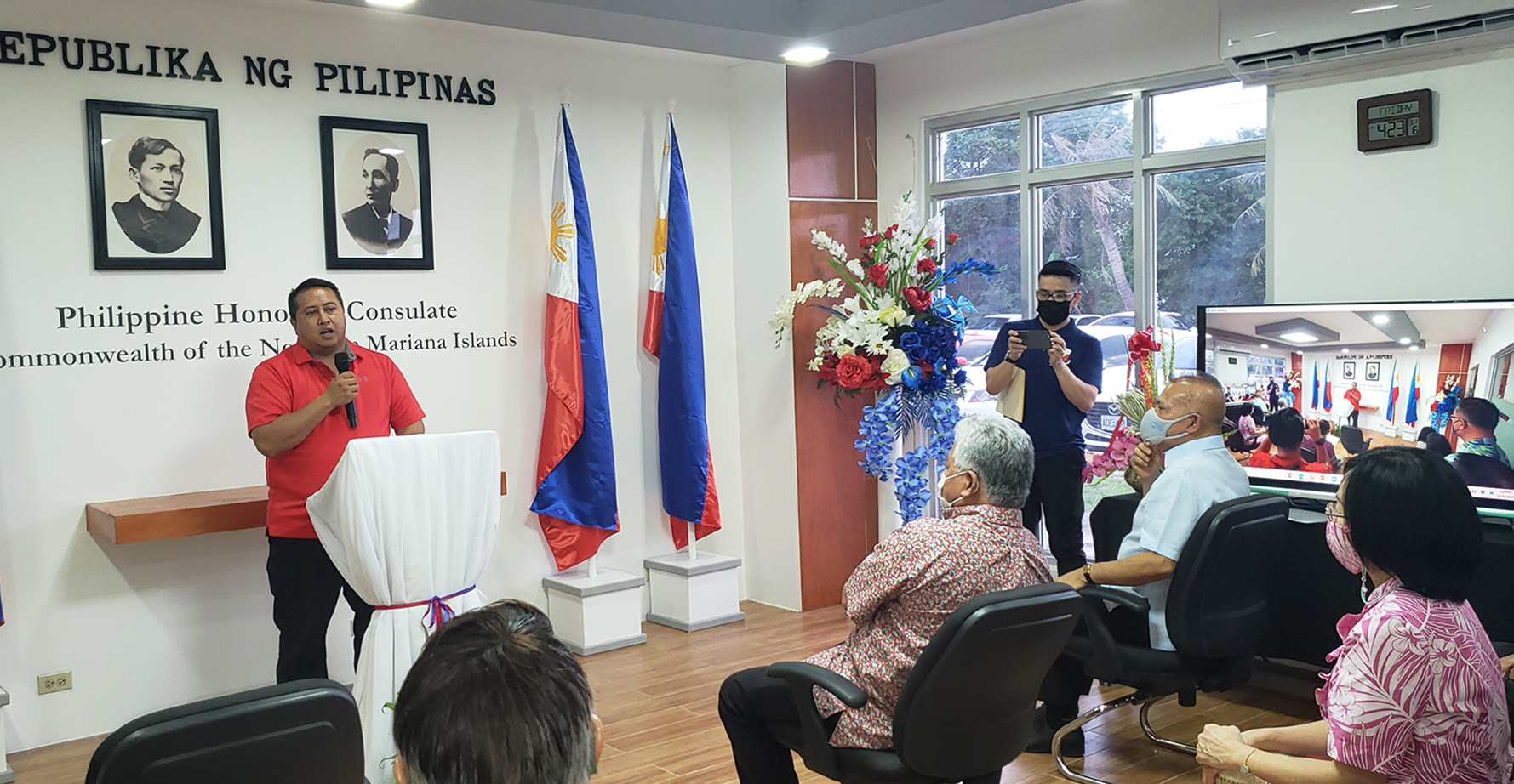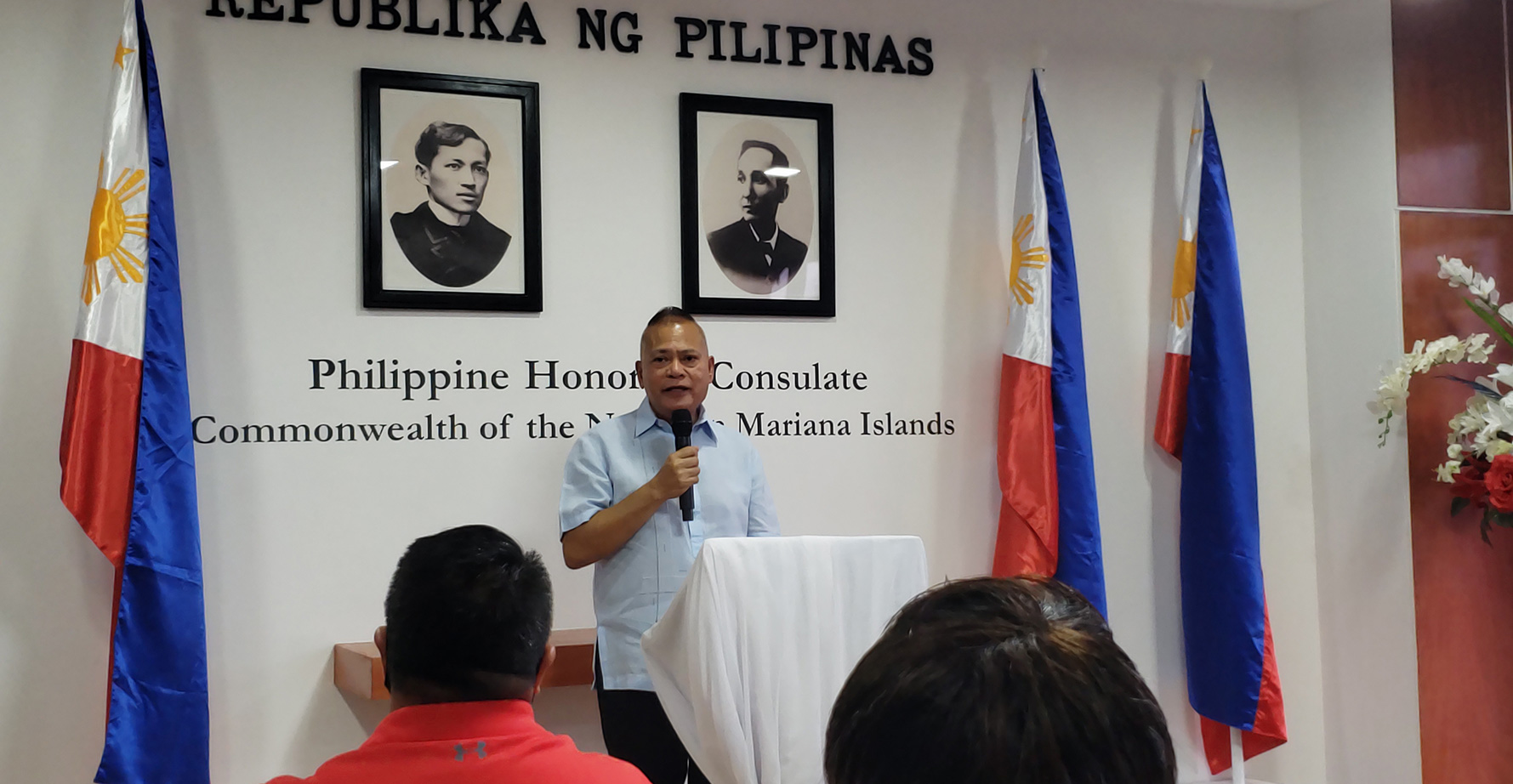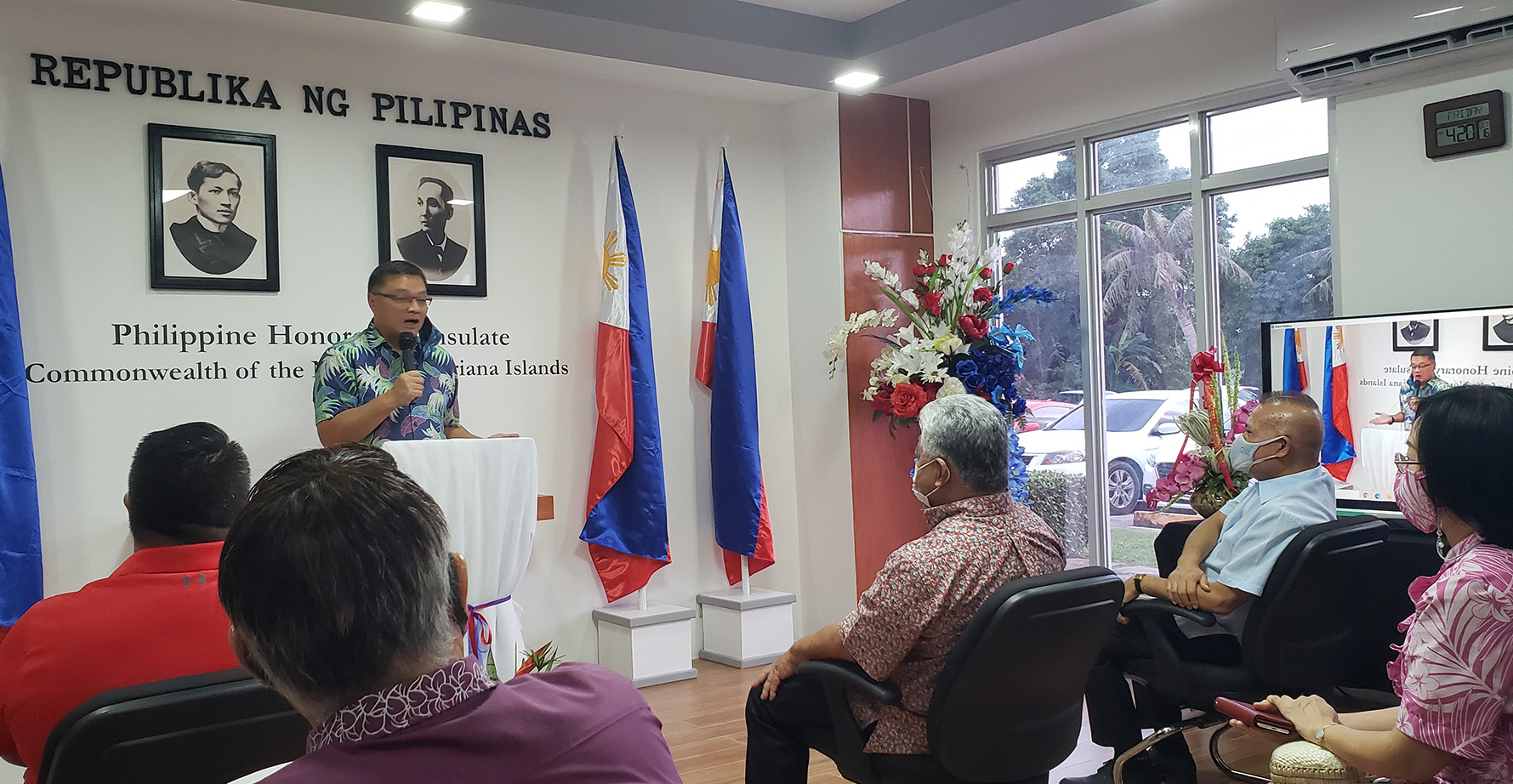 Philippine honorary consul to the CNMI Glicerio “Eli” Arago welcomes guests to the official opening of the Philippine Honorary Consulate Office last Friday, Oct. 16, at the Sun Palace Hotel in Susupe.