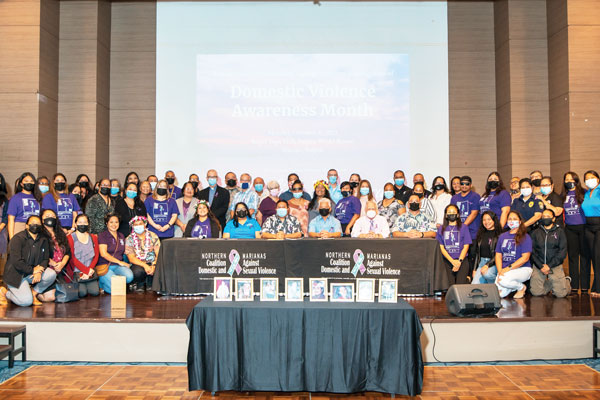 DOMESTIC VIOLENCE AWARENESS MONTH Gov. Ralph DLG Torres and Lt. Gov. Arnold I. Palacios pose for a souvenir picture with Northern Marianas Coalition Against Domestic & Sexual Violence members, community advocates, and supporters of victims of domestic and sexual violence at the Royal Taga Hall of the Saipan World Resort after the signing of a proclamation yesterday designating October as Domestic Violence Awareness Month. (OFFICE OF THE GOVERNOR)