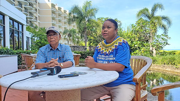 NMI Democratic Party chair Nola K. Hix and vice chair Daniel Quitugua announce the deadline to submit letters of intent to run as governor and delegate for next year’s election at a press conference Tuesday at Hyatt Regency Saipan’s Kili Café and Terrace. The party will announce their candidates for governor and delegate by Nov. 4, 2021. (Ferdie Dela Torre)
