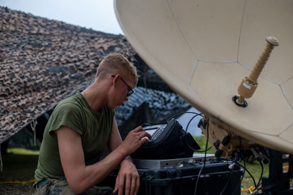 U.S. Marine Corps Lance Cpl. Micah Wilhelm, a radio transmissions operator with 5th Battalion, 11th Marine Regiment, 1st Marine Division, prepares a TAMPA satellite system in support of exercise Freedom Banner on Tinian in the Northern Mariana Islands last Aug. 12, 2021. (LANCE CPL. AUSTIN GILLAM)