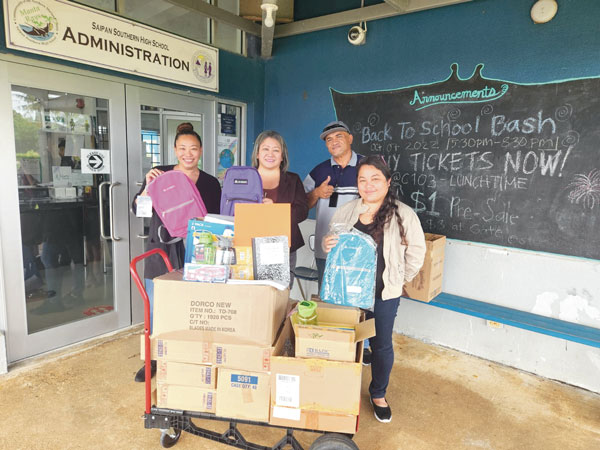 SCHOOL SUPPLIES Sen. Edith E. DeLeon Guerrero (D-Saipan), second from left, and her two staff members, third and fourth from left, deliver school supplies worth $605 to Saipan Southern High School yesterday morning. SSHS vice principal Arisa Sakai Peters, extreme left, receives the donation from the senator. (CONTRIBUTED PHOTO )