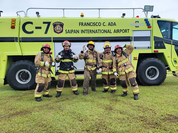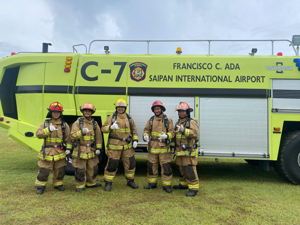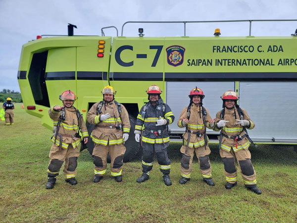 Team Youth Affairs Office, which includes Jonas Okawa, Harry Moses, Eloy Cruz, and Mark Nique, pose for a photo during the Saipan Firefighter Muster Challenge Exhibition last Saturday at the Saipan Airport Field.(CONTRIBUTED PHOTO)