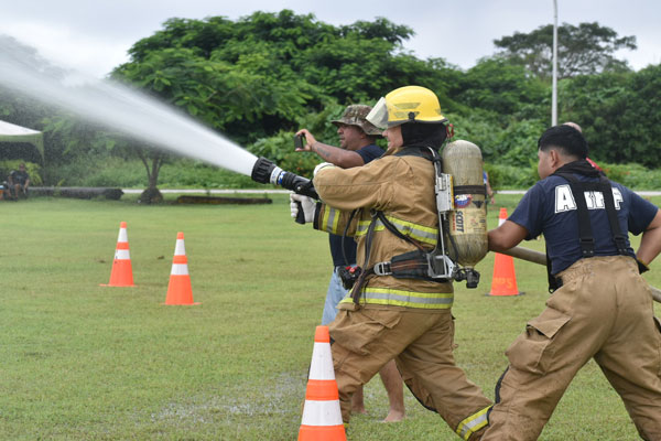 FIREFIGHTER MUSTER CHALLENGE EXHIBITION Brad Ruszala of team Fagaga Fighters advances an attack line and shoots the hose at a target, which simulates fire suppression in station six of the Saipan Firefighter Muster Challenge Exhibition last Saturday at the Saipan Airport Field. (LEIGH GASES)