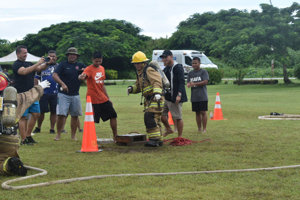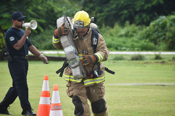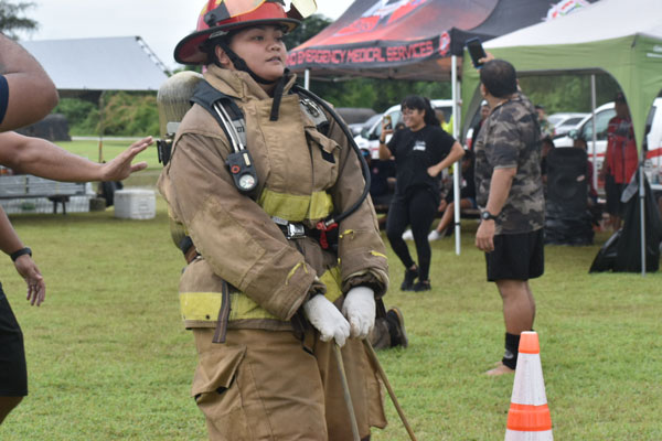 A firefighter demonstrates station four, which is step-ups with a hose bundle during the Saipan Firefighter Muster Challenge Exhibition last Saturday at the Saipan Airport Field.(LEIGH GASES )