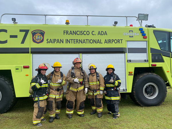 Team Women Power, which includes, from left, Evelyn Pangelinan, Kathy Ruszala, DFEMS firefighter Janika Tenorio, ARFF firefighter Tiffany Santos, and Leigh Gases pose for a photo with the Aircraft Rescue and Firefighting firetruck during the Saipan Firefighter Muster Challenge Exhibition last Saturday at the Saipan Airport Field.(LEIGH GASES )