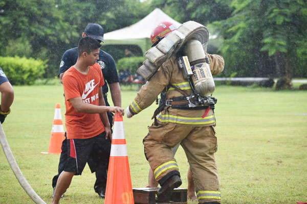 A firefighter runs through station three using a serpentine run with a hose bundle to demonstrate agility during the Saipan Firefighter Muster Challenge Exhibition last Saturday at the Saipan Airport Field.(LEIGH GASES )