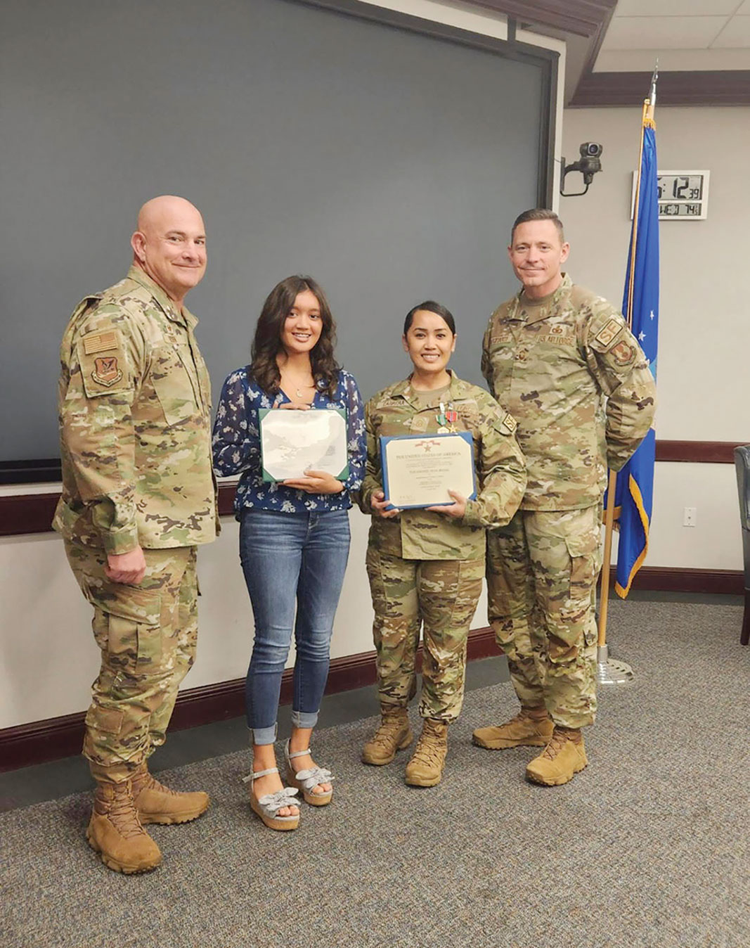 MILITARY AWARDEE-Master Sgt. Nicole Cabrera of the U.S. Air Force, second from right, is awarded the Bronze Star Medal and is also awarded a sister service award, the Army Commendation Medal with a Combat “C” device, for her leadership and efforts while engaged in operations against an opposing armed force while deployed to Iraq in support of Operation Inherent Resolve in 2021. Cabrera is a native of Tinian and is the daughter of Henry and Petra Cabrera. The Bronze Star Medal is awarded to members of the U.S. Armed Forces for either heroic achievement, heroic service, meritorious achievement, or meritorious service in a combat zone. It is the fourth-highest ranking award a service member can receive for a heroic and meritorious deed performed in an armed conflict. (CONTRIBUTED PHOTO)