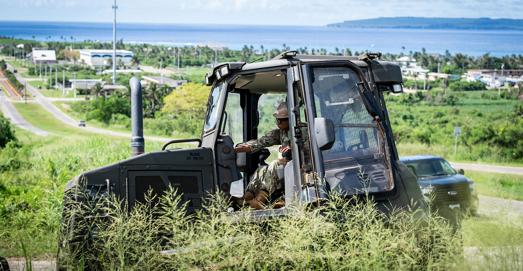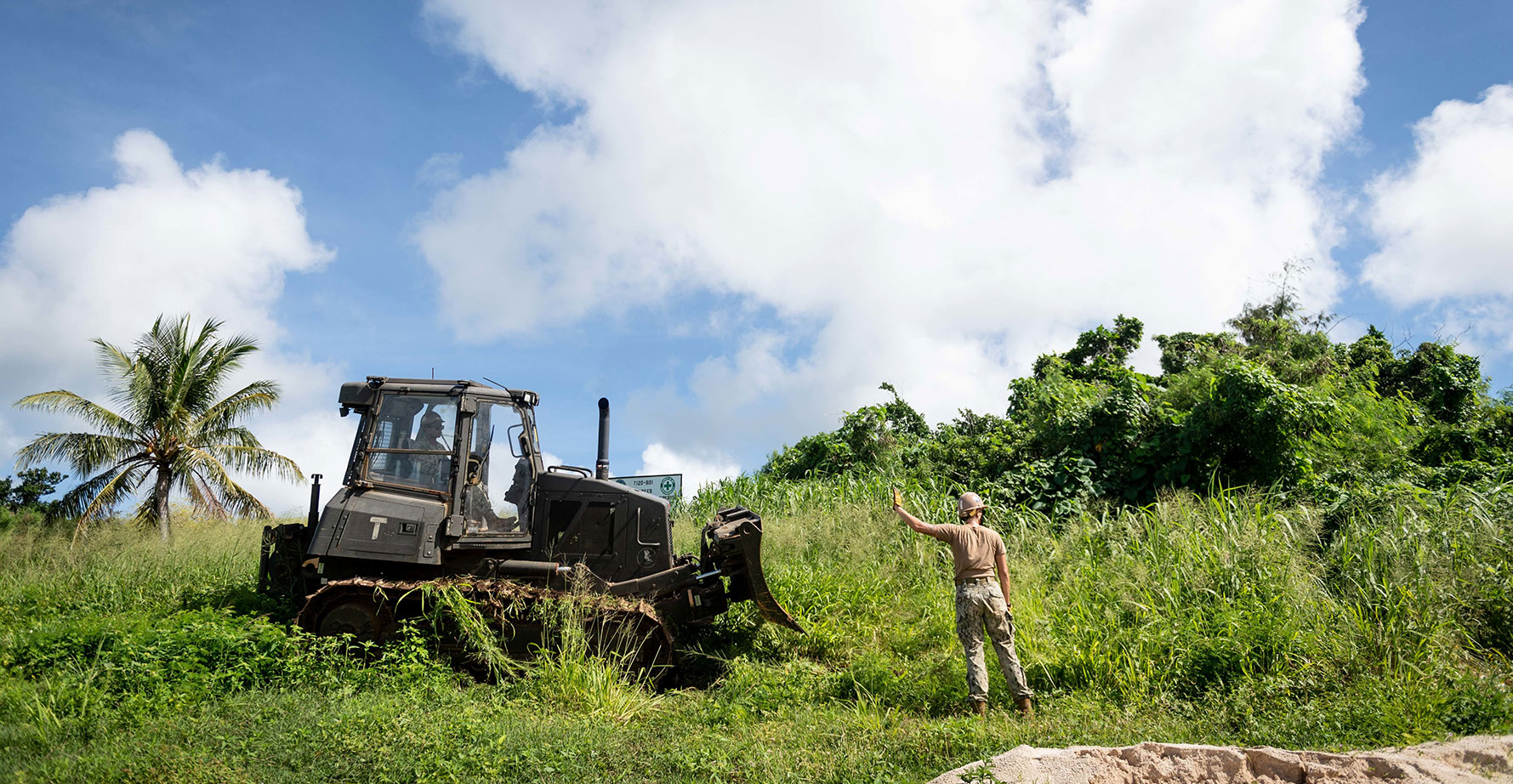 Equipment Operator Constructionman Ramsey Lora, assigned to U.S. Naval Mobile Construction Battalion 3’s Detail Tinian, conducts noninvasive clearing operations on the D5 Dozer to give access to the obstructions on Marpo Heights.