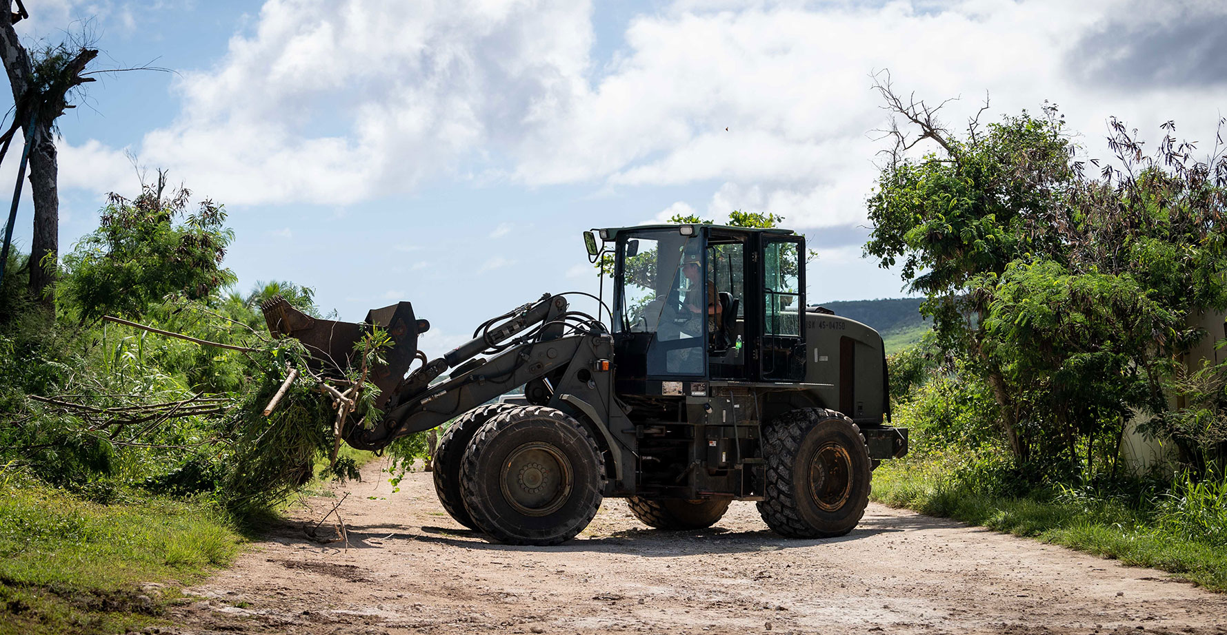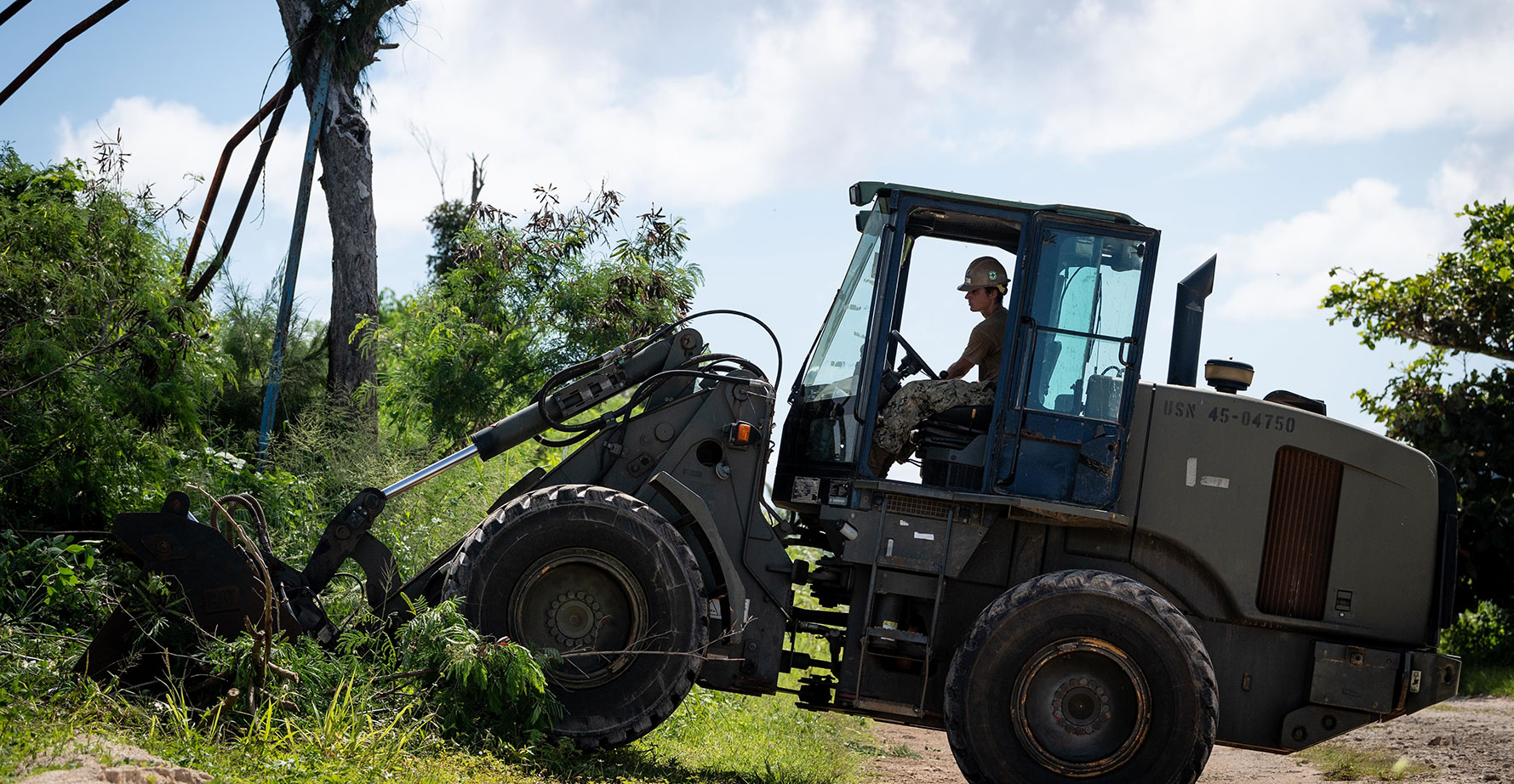 Equipment Operator 3rd Class Cord Price, assigned to U.S. Naval Mobile Construction Battalion 3’s Detail Tinian, utilizes a clamshell bucket on the 924 Loader to remove downed obstructions in support of Marpo Heights Road G construction.