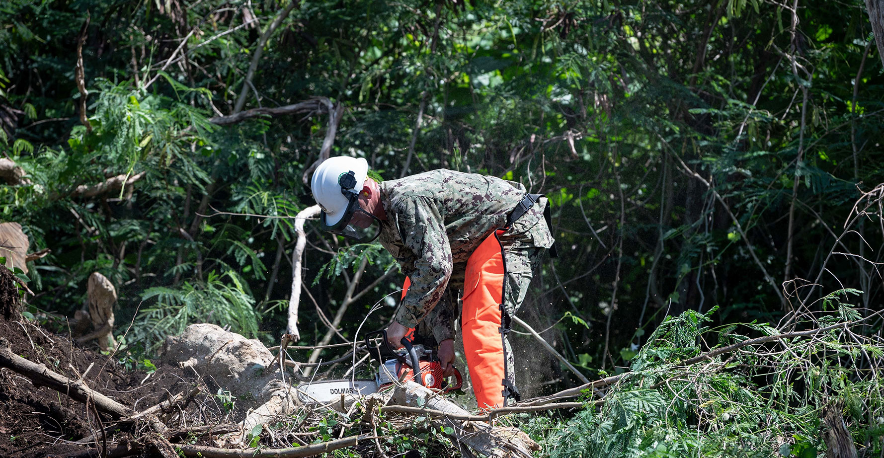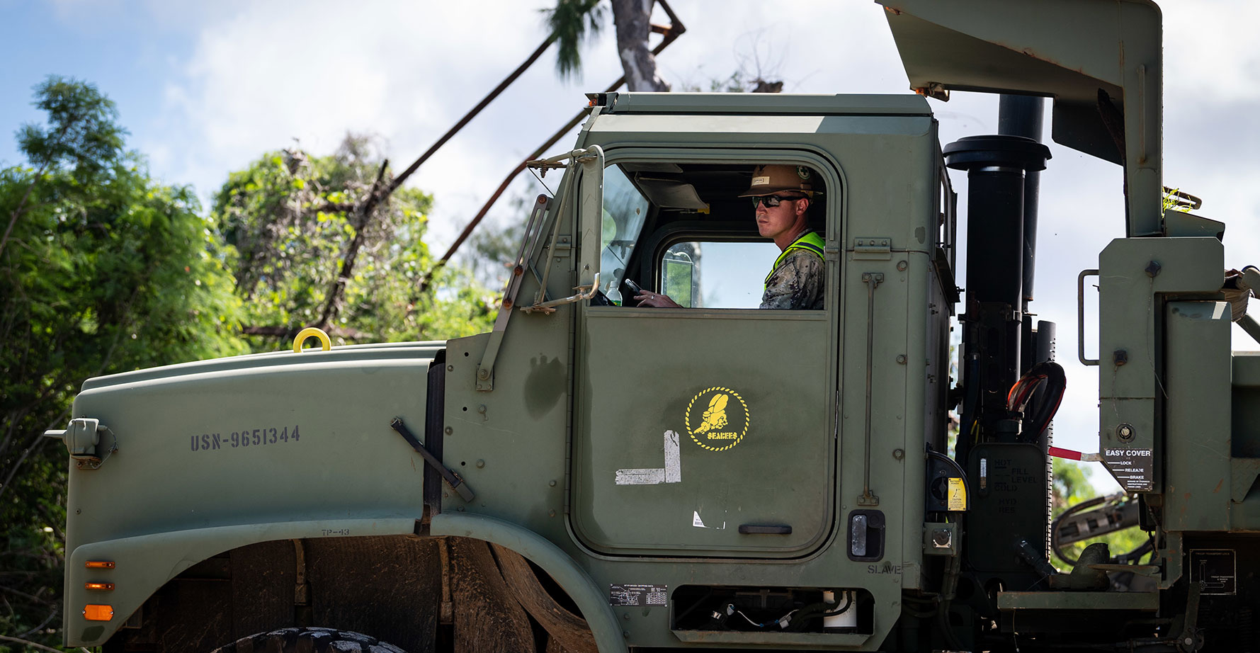 Senior Chief Equipment Operator Matthew Kreamalmyer, U.S. Naval Mobile Construction Battalion 3’s Detail Tinian assistant officer-in-charge, provides on the job training to the NMCB-3 Detail Tinian road crew on safe and proper tree topping operations. NMCB-3 is deployed across the Indo-Pacific region conducting high-quality construction to support U.S. and partner nations to strengthen partnerships, deter aggression, and enable expeditionary logistics and naval power projection. The battalion stands ready to complete assigned tasking, support Humanitarian Aid/Disaster Relief and Major Combat Operations throughout the area of responsibility.