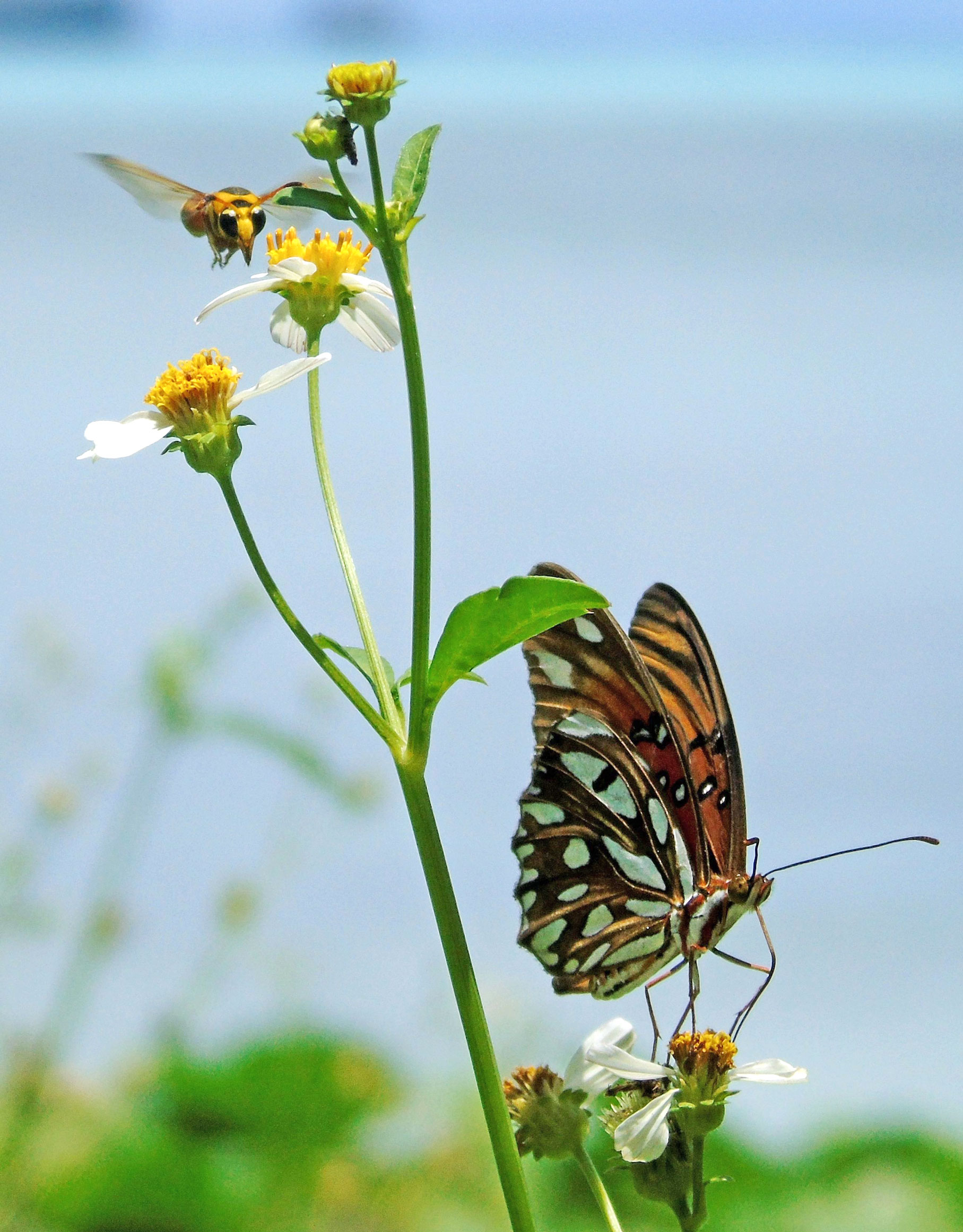 Image shows a Gulf Fritillary butterfly and a honey bee collecting nectar from a small bunch of Tridax daisies at Kilili Beach in Susupe. (Neil Fama)