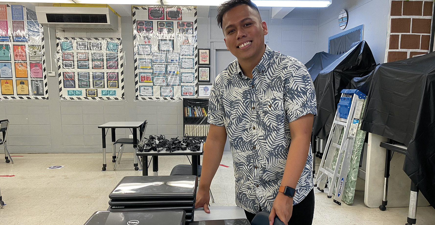 FREE LAPTOPS-John Darag, Marianas High School English and Language Arts teacher, shows the laptops that will be distributed among students who would need the devices for their participation in online classes for this school year, which started last Tuesday