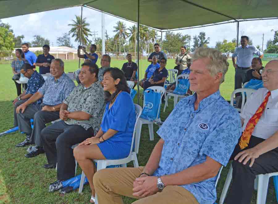 Michael White, president of Northern Marianas Sports Association, which manages the Francisco “Tan Ko” Palacios Ballfield, thanks IT&E for the installation of the scoreboard.