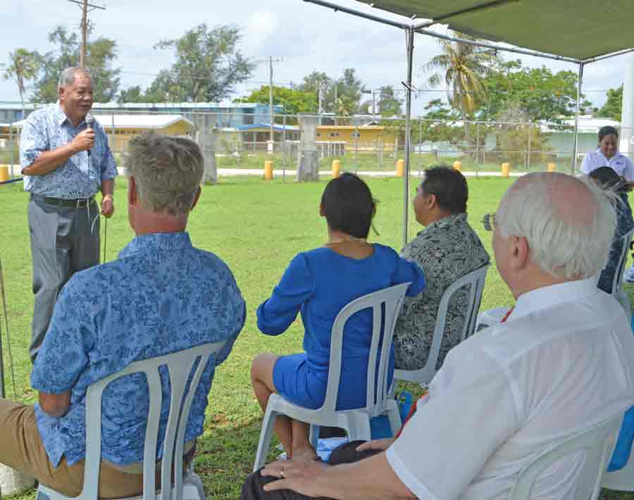 IT&E chief executive officer James Oehlerking delivers a brief message during the inauguration ceremony of the IT&E baseball scoreboard at the Francisco “Tan Ko” Palacios Ballfield yesterday. Also in the photo listening to Oehlerking are Gov. Ralph DLG Torres and Saipan Mayor David M. Apatang.