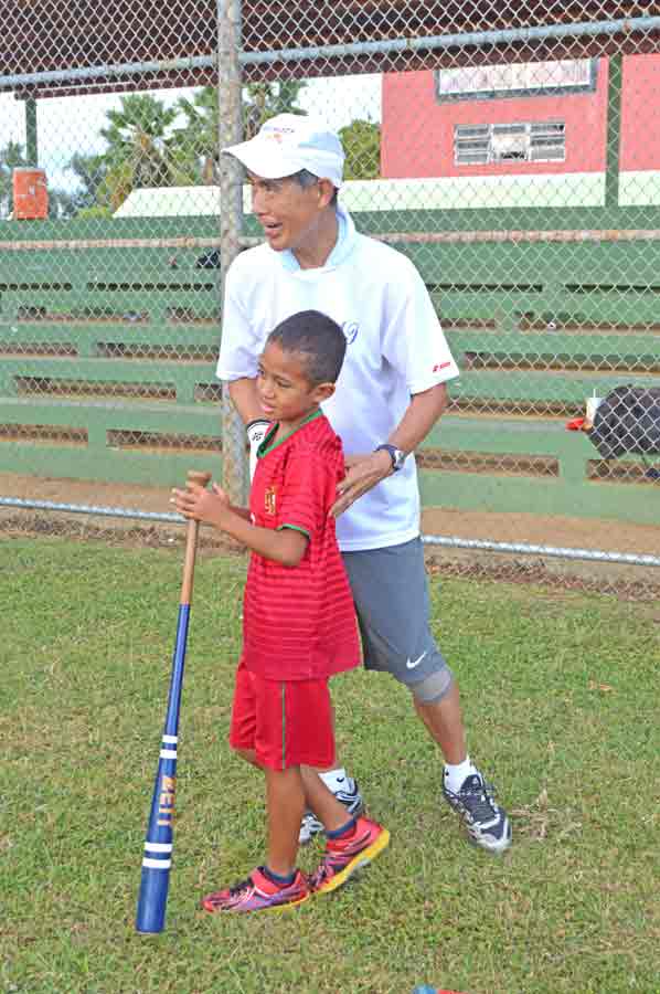 Saipan players and Japanese Consul Toshio Matsumura, fifth left second row, pose with the baseball pros from Japan’s Nippon Professional Baseball after the short clinic at the Francisco “Tan Ko” Palacios Ballfield last Sunday.