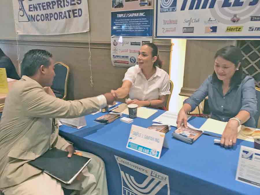 Triple J Enterprises employees conduct interviews at the 2018 Cooperative Education Job Fair at the Saipan World Resort’s Royal Taga Hall last Thursday.