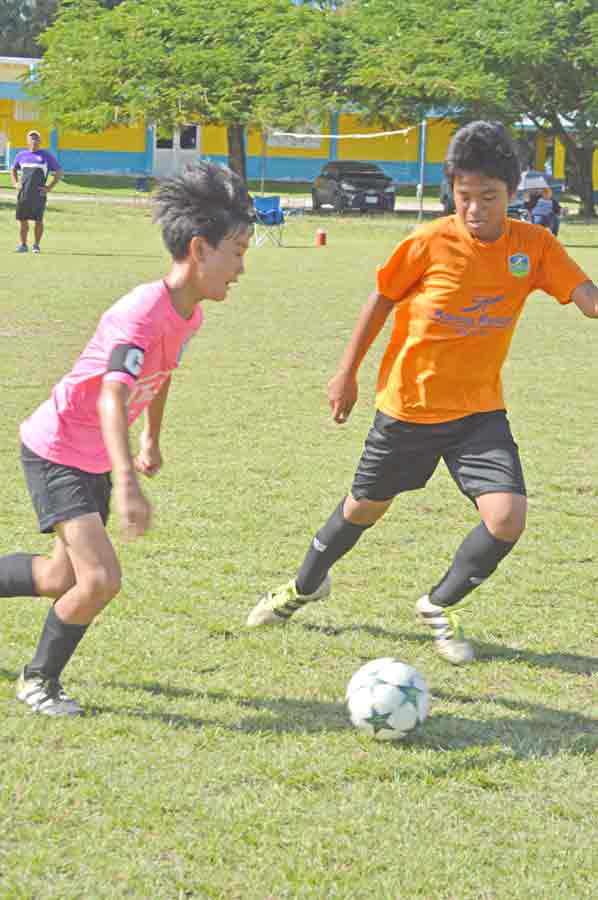 MP United Football Club’s Andrew Chung, left, is guarded by Kanoa-1 FC’s Daniel Mar Pablo during the second half of their co-ed U12 division game in the 2017 NMIFA Fall Youth League last Saturday at the Hopwood Middle School Field. (Roselyn B. Monroyo)