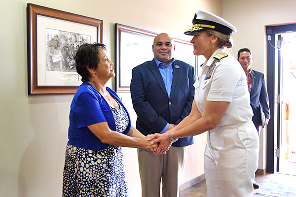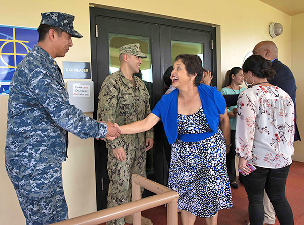 Chief Operations Specialist Nestor Martinezvasquez greets Guam Gov. Lou Leon Guerrero at the Joint Region Marianas headquarters in Asan last Jan. 24. Leon Guerrero and Lt. Gov. Josh Tenorio visited the command and received a brief from JRM Commander Rear Adm. Shoshana Chatfield and other senior leadership about military operations on the island. (U.S. Navy Photo By Alana Chargualaf)