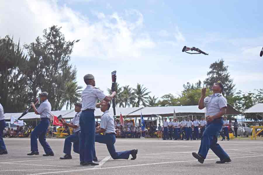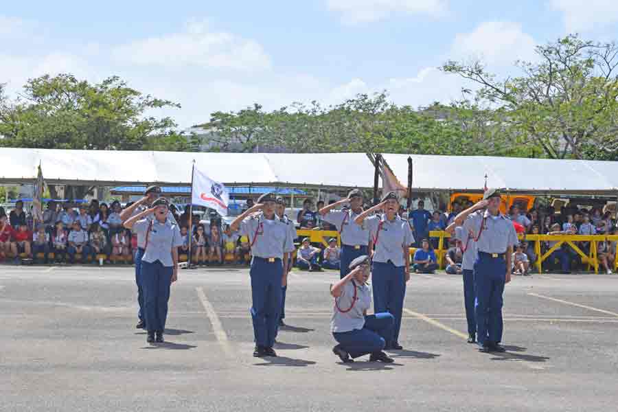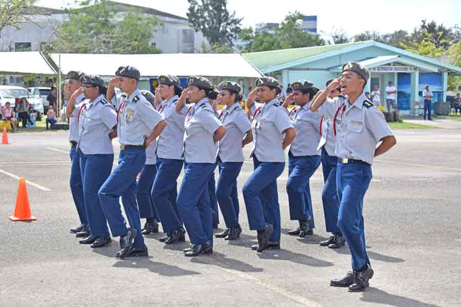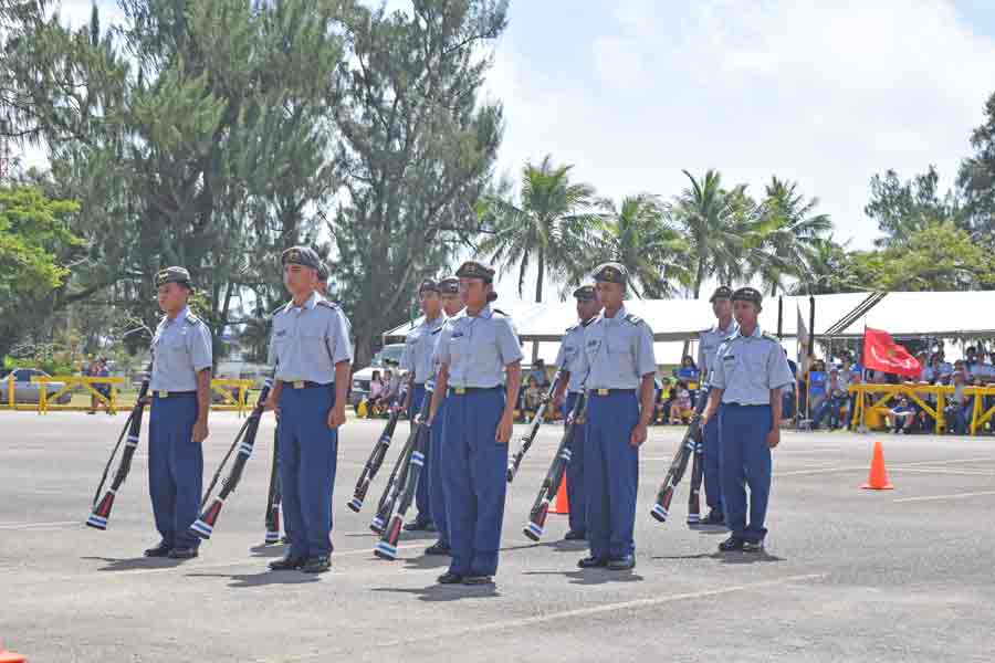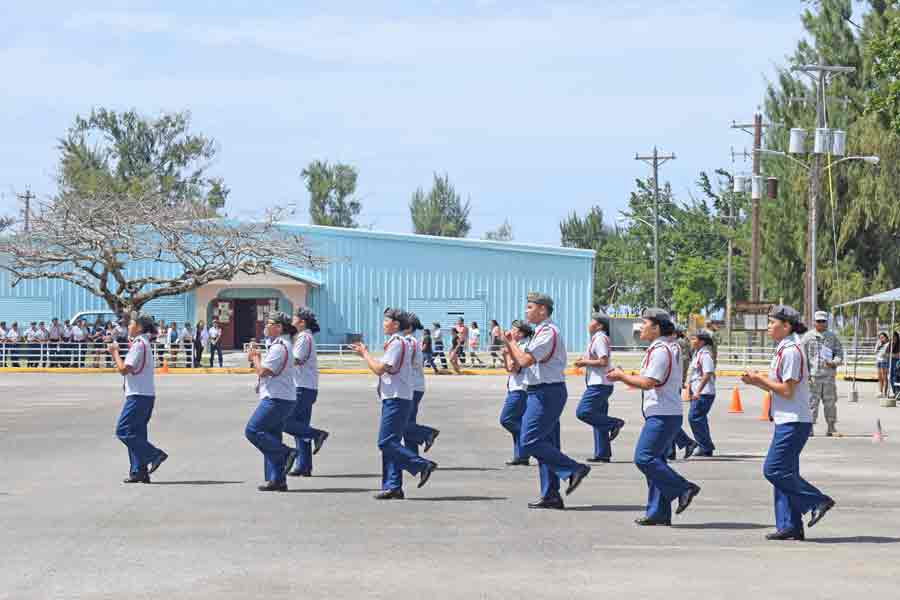 The Tinian Junior-Senior High School’s armed exhibition team is in formation before their routine in last Saturday’s 2017 CNMI PSS Multiple School Unit drill meet at the Marianas High School parking lot.
