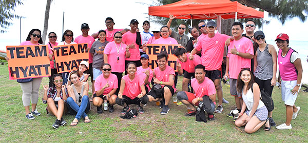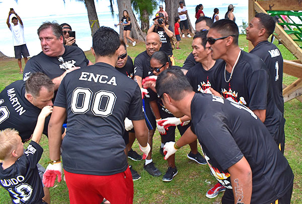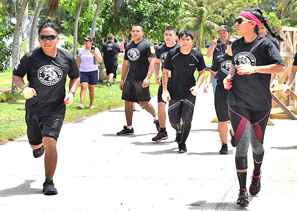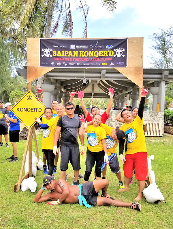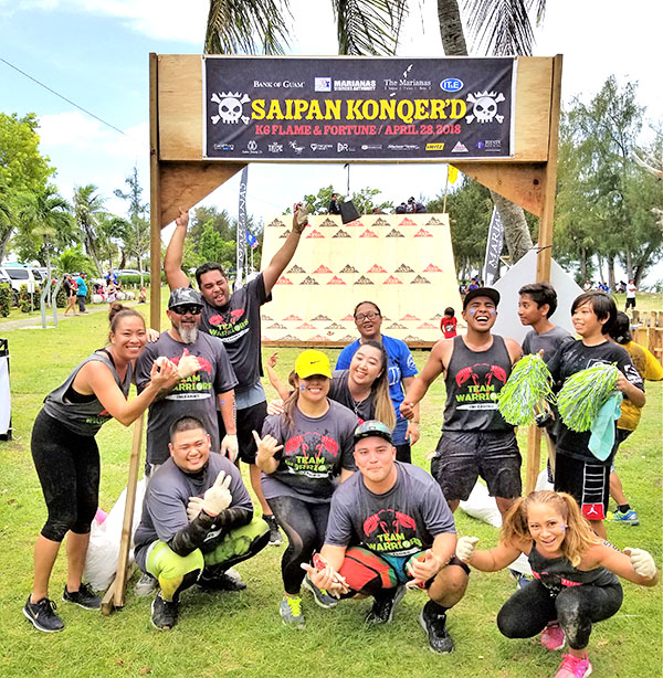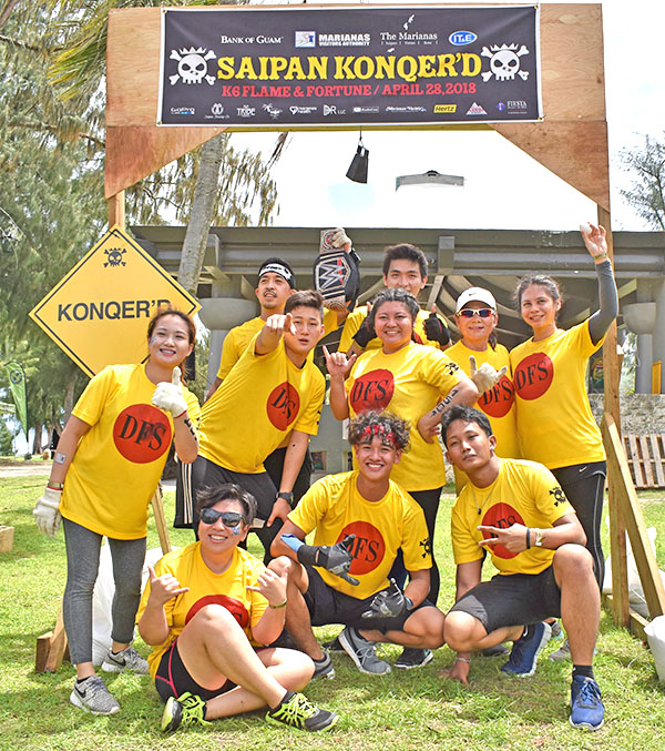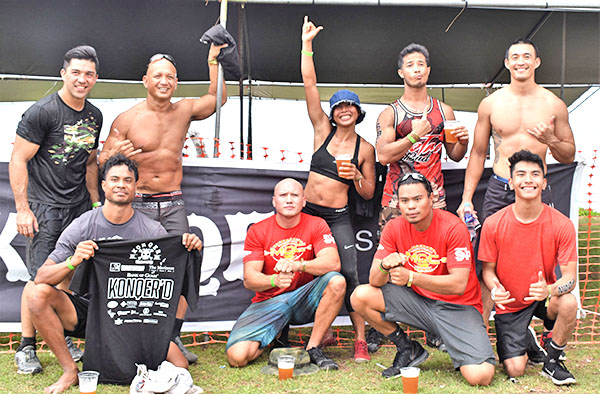 Members of Team Saipan Brewing celebrate at the finish line after completing the KONQER Saixpan obstacle course last April 28 at the Kilili Beach Park in Susupe.