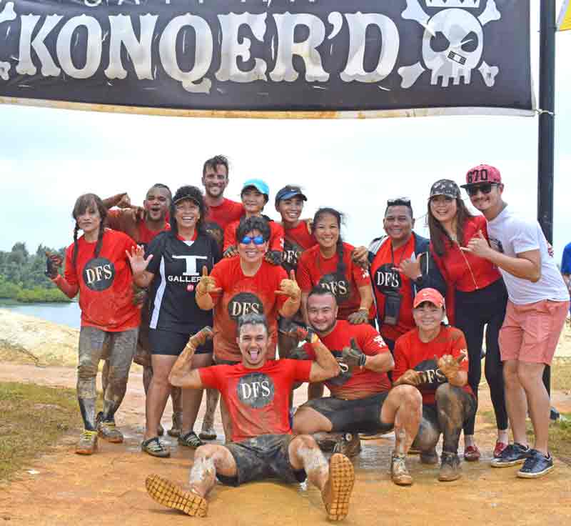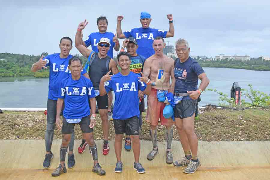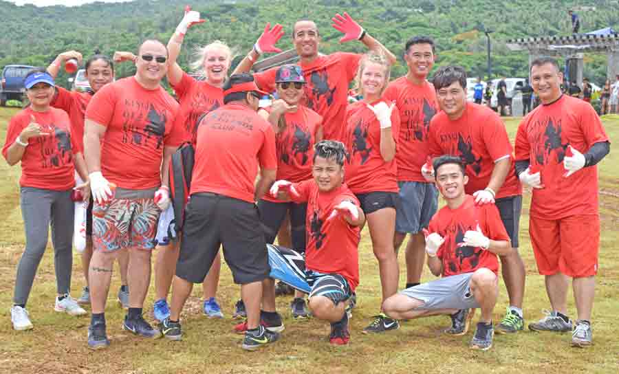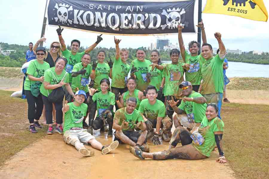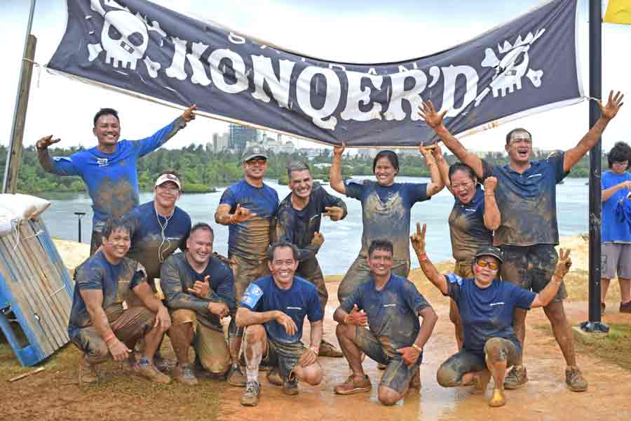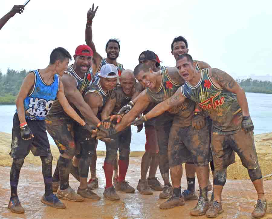 Pacific Trading Co. general manager Charles Cepeda, third left, and Team PTC Mountain Dew gather for a photo after completing the rain-soaked obstacle course.