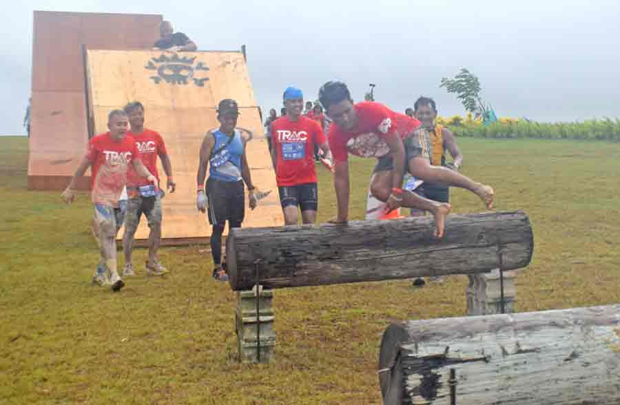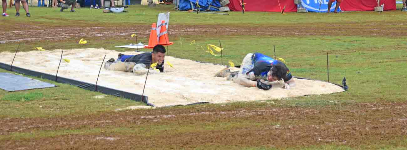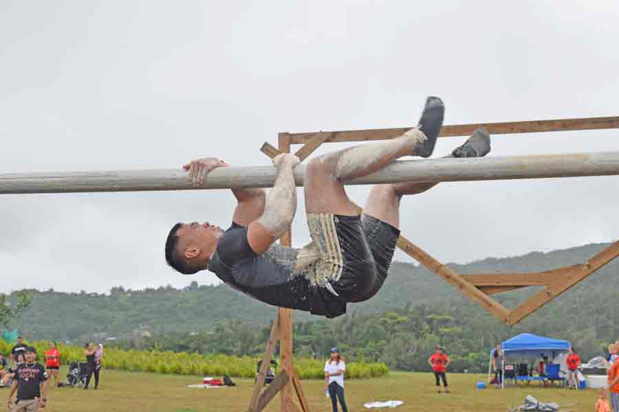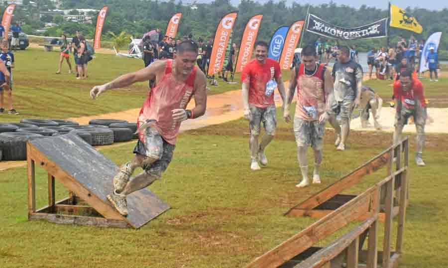 Two participants crawl their way out of the first obstacle in last Saturday’s KONQER Saipan King of the Hill at the Gov. Eloy S. Inos Peace Park in Puerto Rico.