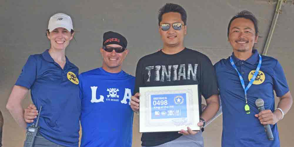 Marianas Visitors Authority managing director Chris Concepcion, third left, receives a race bib from KONQER Sports chief executive officer Kazu Endo, right, and KONQER Sports president Kelli Wedd, left. Also in the photo is former Saipan resident Jon Cramer, second left, one of the event hosts.