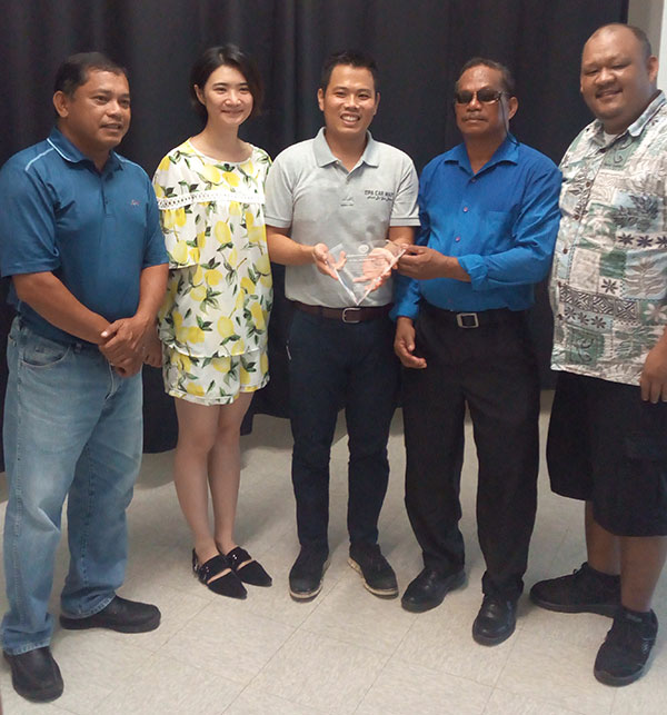 House Speaker Ralph Demapan and Saipan and Northern Islands Legislative Delegation chair Rep. John Paul Sablan join Max Aguon in presenting an appreciation plaque to Pengcheng (PC) Wu of DPA Car Mart. (Contributed Photos)