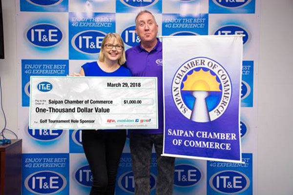 The Saipan Chamber of Commerce accepts a contribution from IT&E valued at $1,000 which includes hole sponsorship, raffle items, and monetary donation. From left, Jill Arenovski, executive director, Saipan Chamber of Commerce; and Rob Harrell, executive director of customer operations, IT&E. (Contributed Photo)