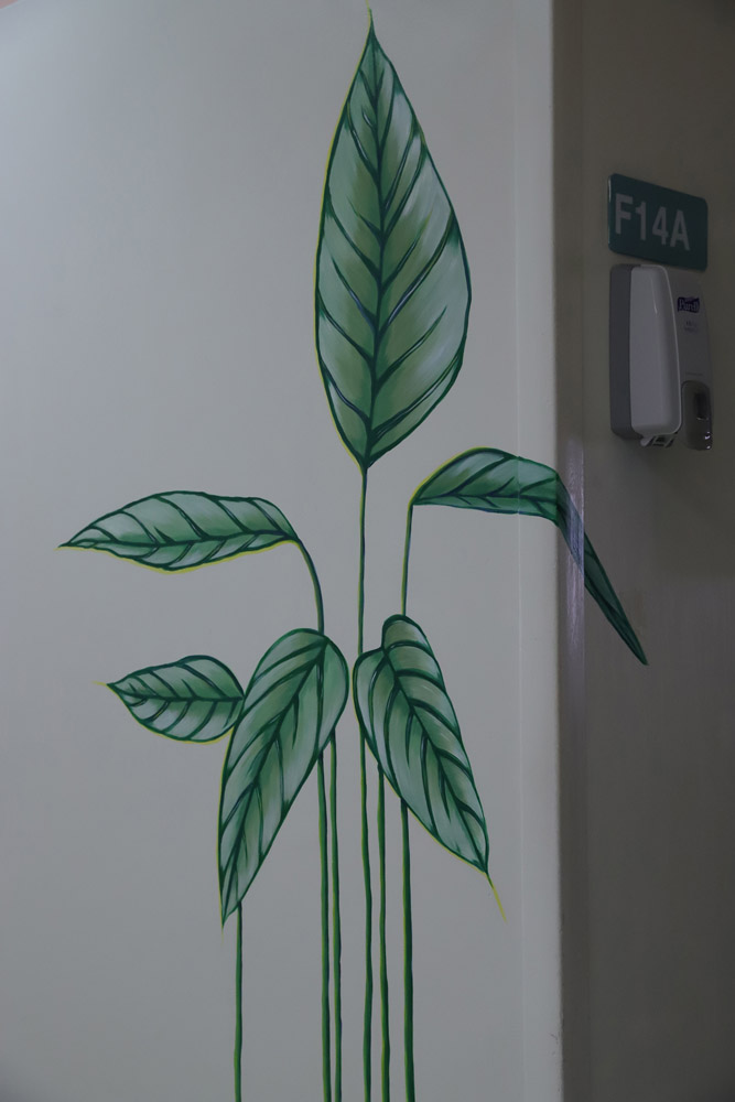 Benavente painted a mural of plants, leaves, and flowers to bring a bit of island beauty indoors.