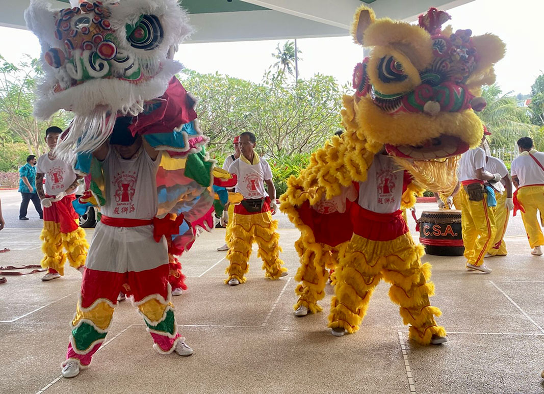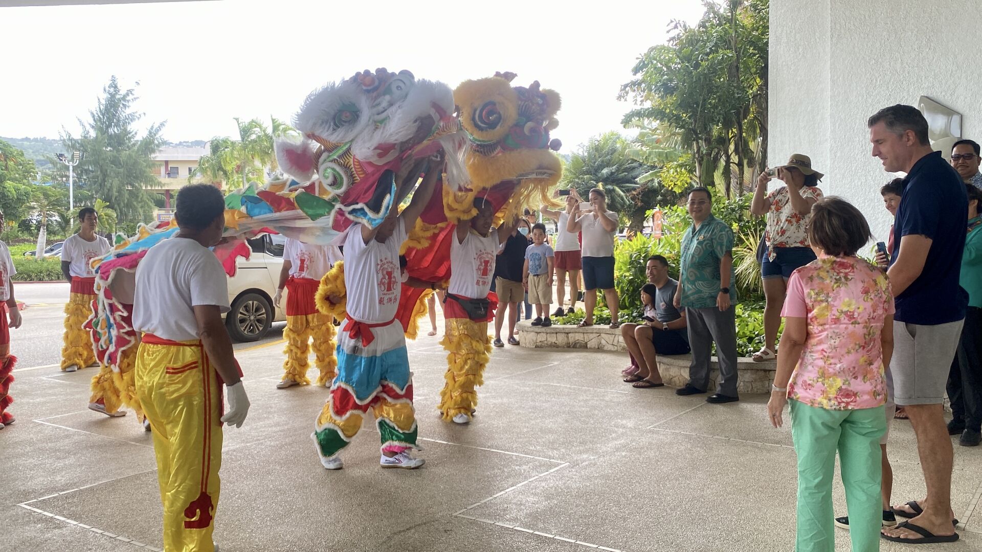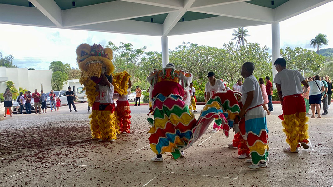 The lion dancers make their way to the Kili Cafe and Terrace of the Hyatt Regency Saipan to ward off evil spirits and usher in good luck in the Year of the Rabbit during the first day of the Lunar New Year Sunday morning. (LEIGH GASES)
