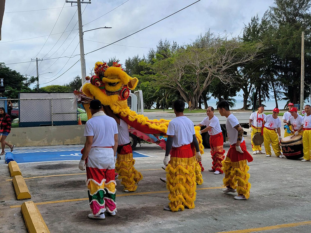 Lion dancers of the Chinese Association of Saipan perform outside the Realty Management Services office inside the JP Center building to usher in the Year of the Rabbit last Sunday morning. (LADYVIR CANAPE)