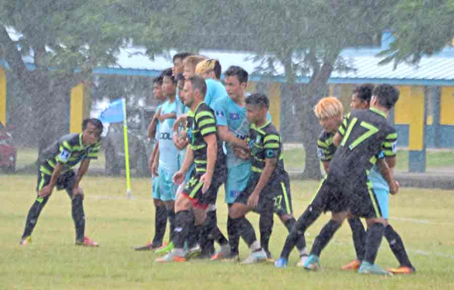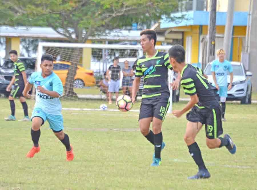 TanHoldings Football Club’ Alan Hinson, right, is closely guarded by the Teen Ayuyus’ John Guiller Canape, left, and Razeff Altamirano during their title game in the Division A of M-League late last month at the Hopwood Middle School Field.